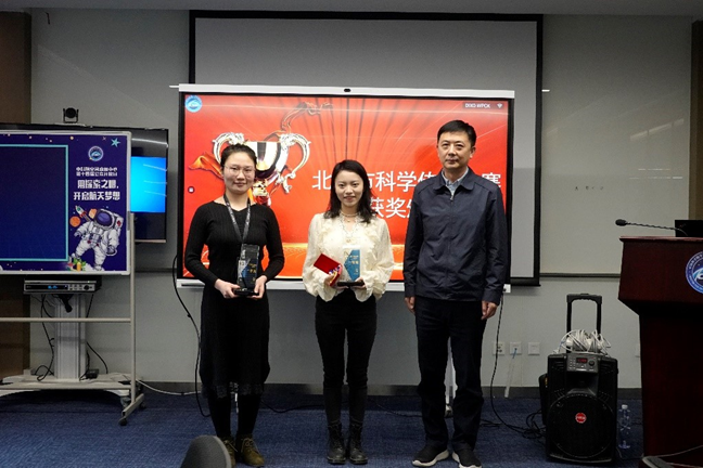 图:中心党委副书记王志伟为获奖讲解员颁奖 2021年,在完成中心各项科普工作的同时,协会志愿者还积极参与北京市科普活动。在北京市科协举办的第三节北京科学传播大赛中,我中心讲解员积极参与并获得佳绩。王怡苏获得科普讲解志愿者组一等奖并获得金牌讲解员称号,赵婷婷获得科普讲解志愿者组三等奖,中心获得最佳组织奖。活动现场,王志伟书记为两名获奖者颁奖。